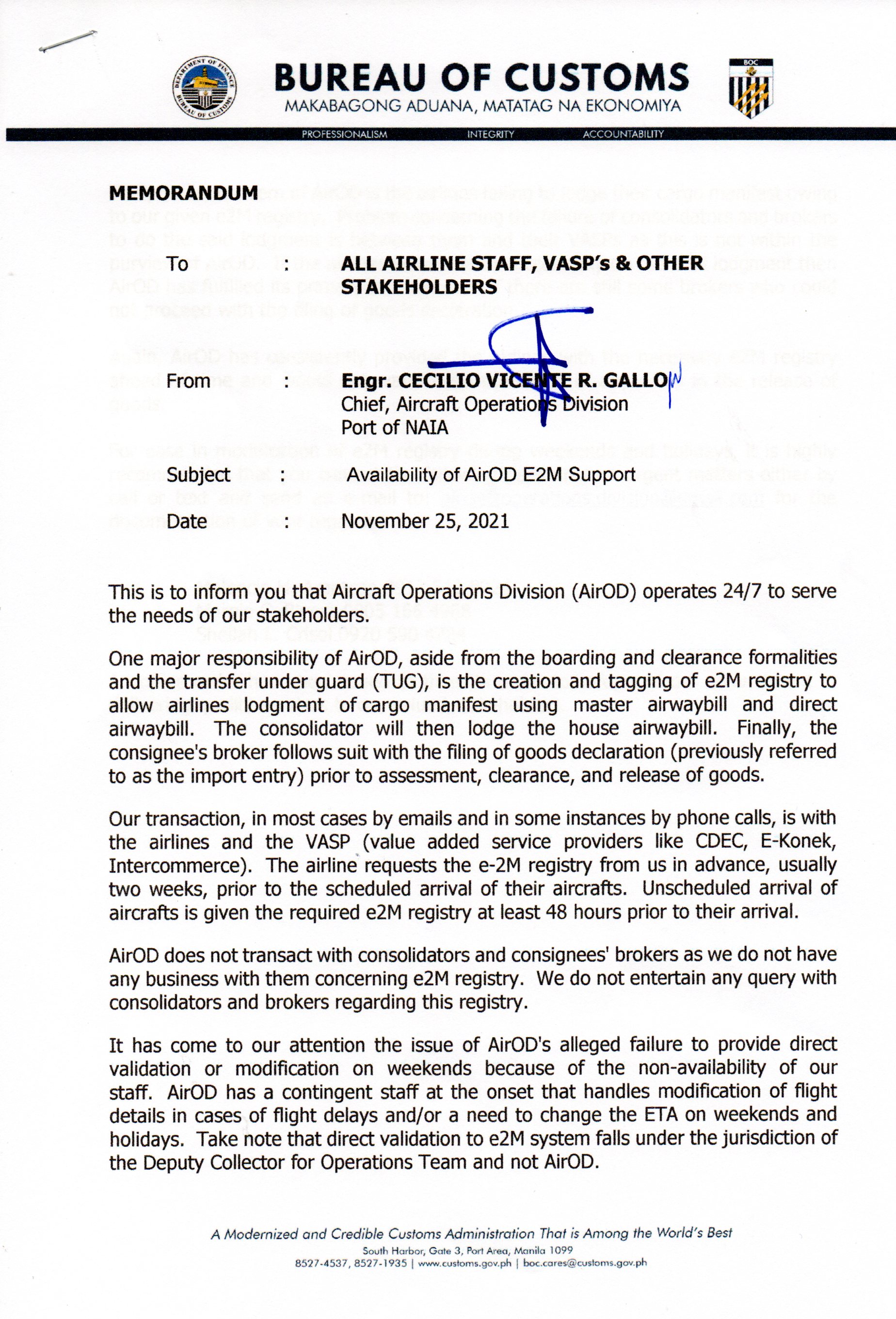 Memorandum e-Manifest submission affected during the downtime - signed |